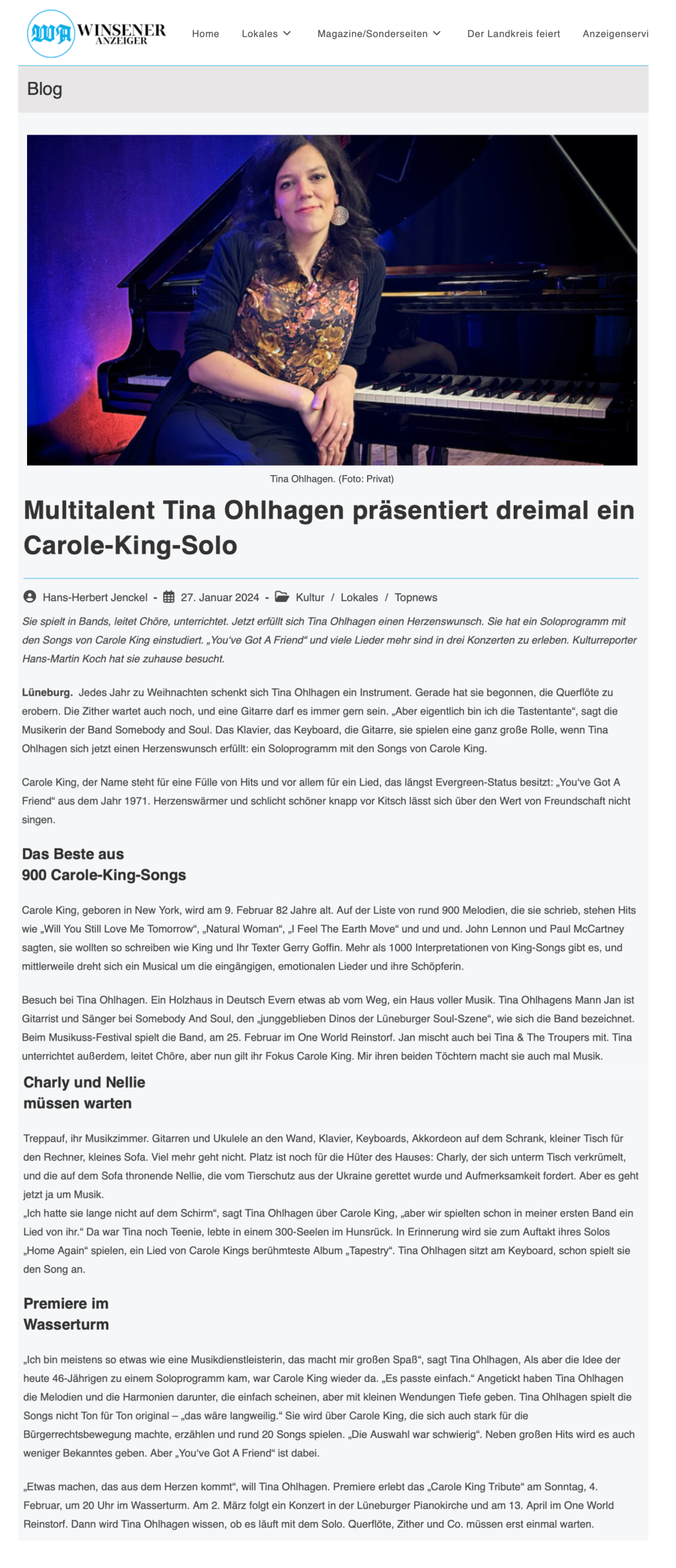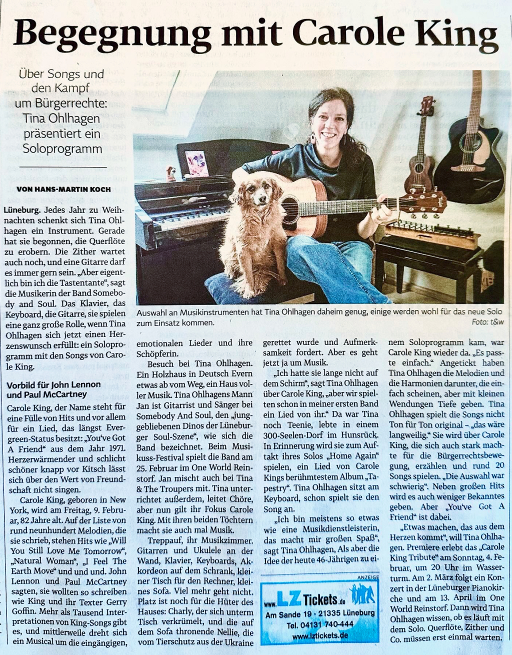 "Hallo Tina, ich höre schon den ganzen Tag die Lieder von Carole King. Danke für den schönen Abend und die tolle musikalische Inspiration."
